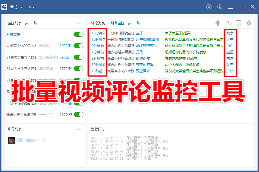 “黄瓜-抖音视频评论实时监控” 是一款专注于抖音视频评论动态实时追踪、多维度用户筛选与精细化运营的专业工具。从多视频批量监控到用户画像深度挖掘,从评论数据智能筛选到跨端消息触达,全方位覆盖抖音视频评论场景,助力创作者、运营者高效掌控舆情走向、精准转化目标用户。
