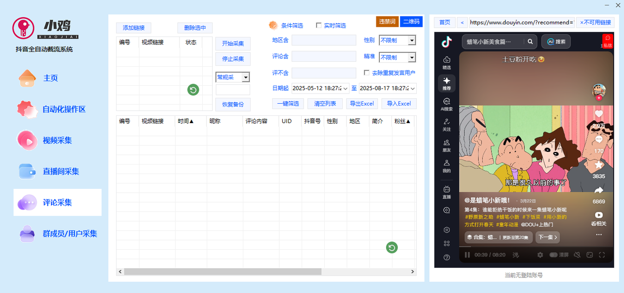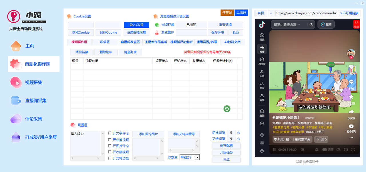 1.一键导入采集的视频链接,设置评论内容及参数,一键批量视频评论,点赞,收藏。