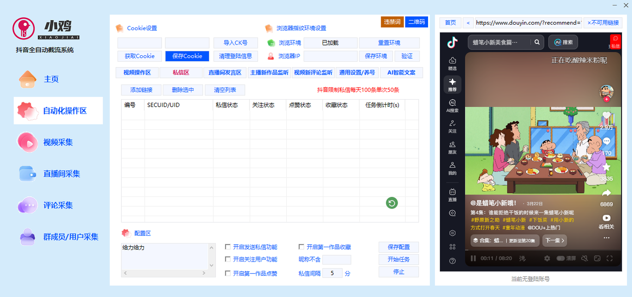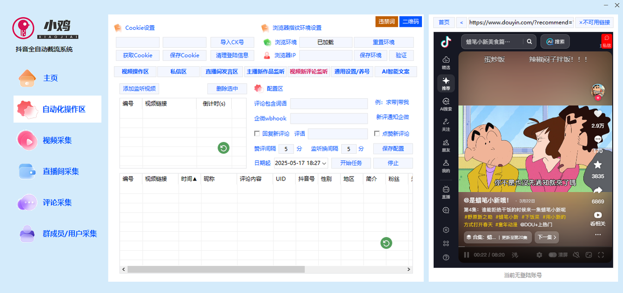 4.导入主播主页链接,开启监听,批量监控多个主播发布的新作品并通知,然后批量自动化评论点赞收藏。