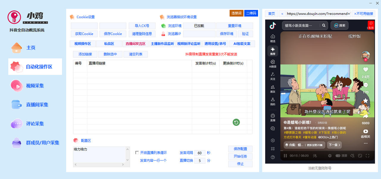 3.导入直播间链接,设置直播间发言弹幕内容,一键批量多个直播间发言。