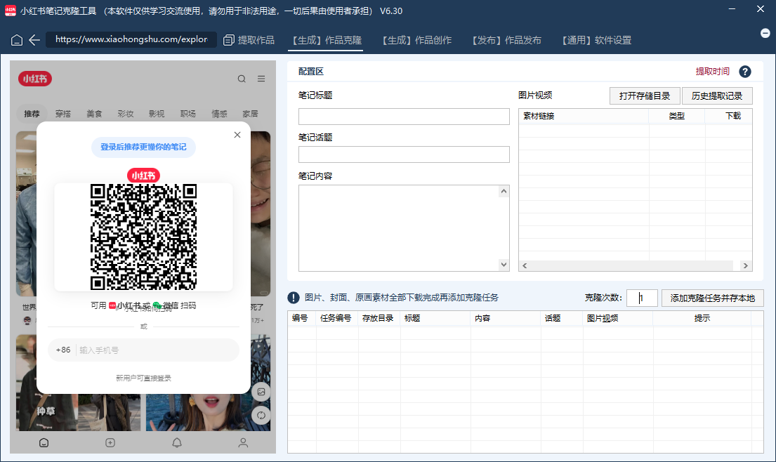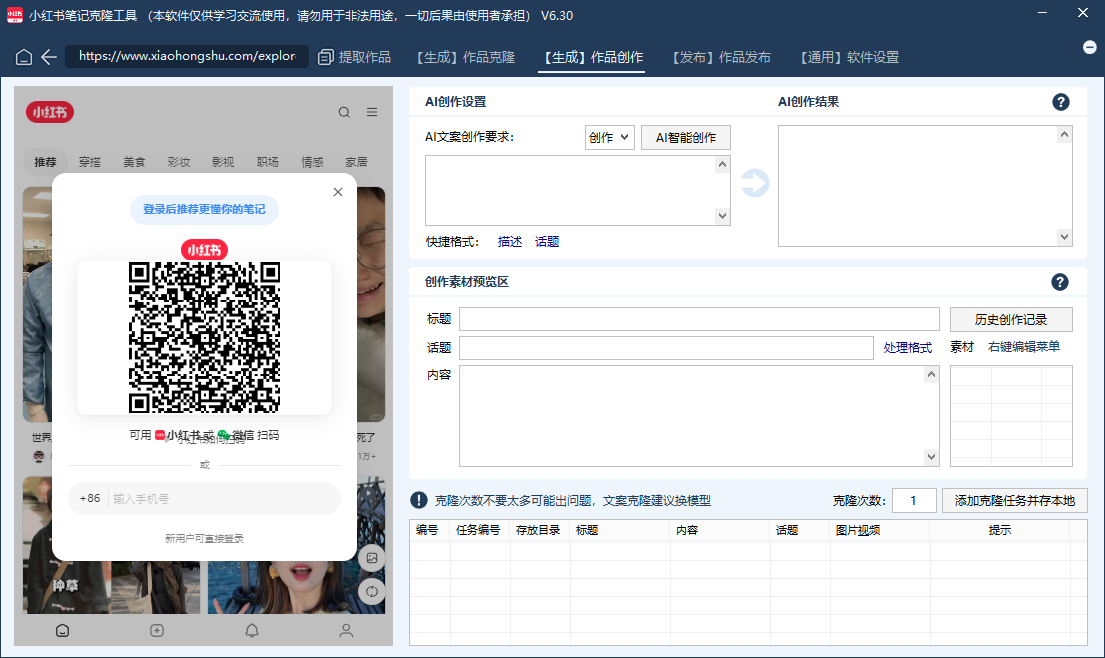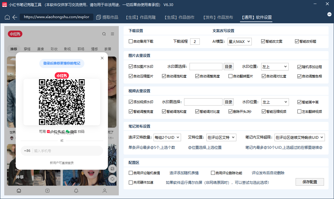 小红书AI克隆工具是一款全功能的笔记批量发布工具,支持作品笔记搬运克隆,内置指纹浏览器防封环境,账号无限多开批量发布,笔记一键AI改写,视频/图片一键双重去重,内置五个AI生成式大模型,无需额外付费及配置接口。