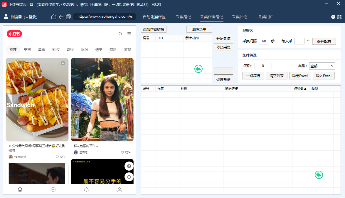 3.笔记评论采集(支持条件筛选,导出excel,支持添加用户关注截流操作)