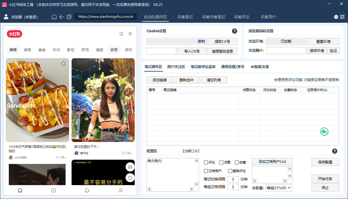 可批量搜索关键字采集笔记或主播主页笔记,批量采集笔记评论等多种截留采集功能。将采集到的笔记链接或评论用户id自动一键导入自动化操作区进行笔记评论点赞收藏,批量关注收藏评论用户,以及自动化随机看视频养号等等多种功能为一体的小红书引流神器。
