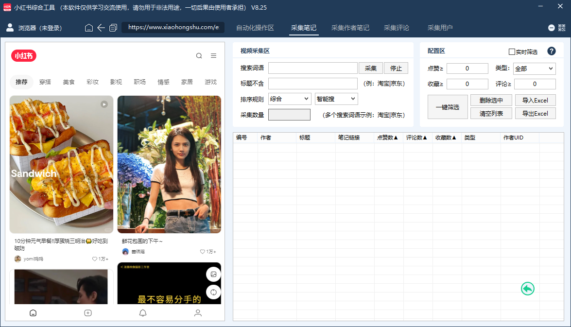 2.批量关键词采集笔记链接及指定主播笔记链接采集(关键词筛选,可条件筛选,导出excel)