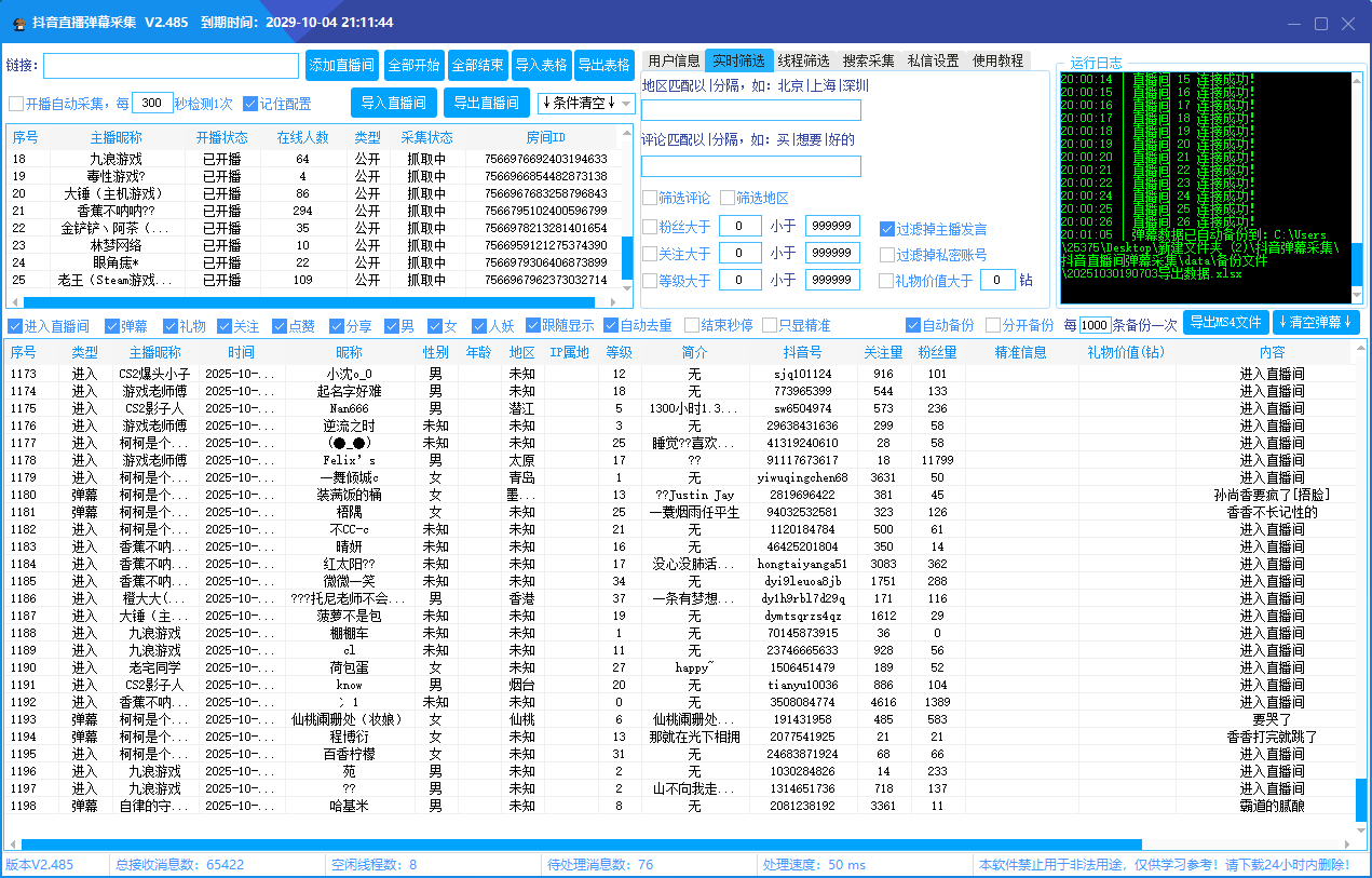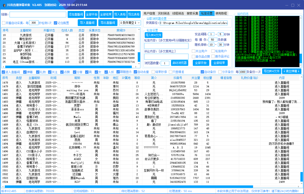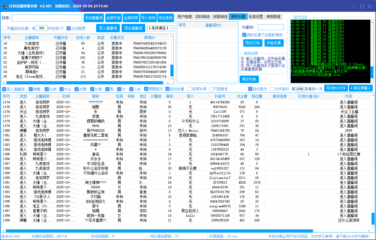 “抖音直播间弹幕等信息采集” 软件是一款专注于抖音直播间多维度数据采集、用户精准筛选与自动化运营的专业工具。从直播间批量管理到用户信息深度挖掘,从关键词精准搜索到自动化私信触达,全方位覆盖直播运营场景,助力各行业实现高效获客、粉丝沉淀与私域转化。