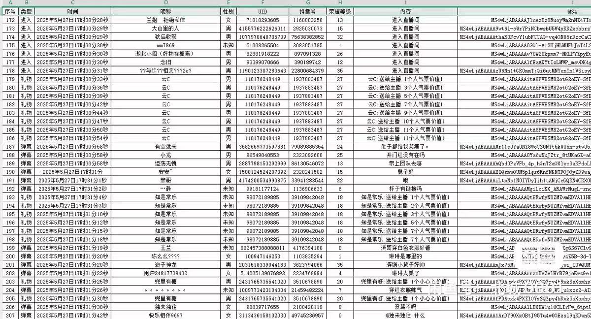 - 数据字段完整,涵盖 “精准信息(如联系方式)、礼物价值、行为内容” 等,助力用户画像深度分析。